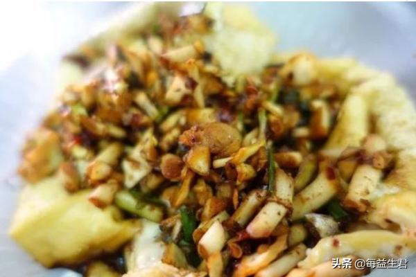 荞凉粉分心和皮,皮就是面上的一层,比较硬,颜色也更深,正因为如此,外表的皮荞麦味更浓一些,里面的就显得很软滑。配上一小碗蘸水,蘸水最不可缺少的就是霉豆腐,霉豆腐可以说是荞凉粉蘸水的“灵魂”。