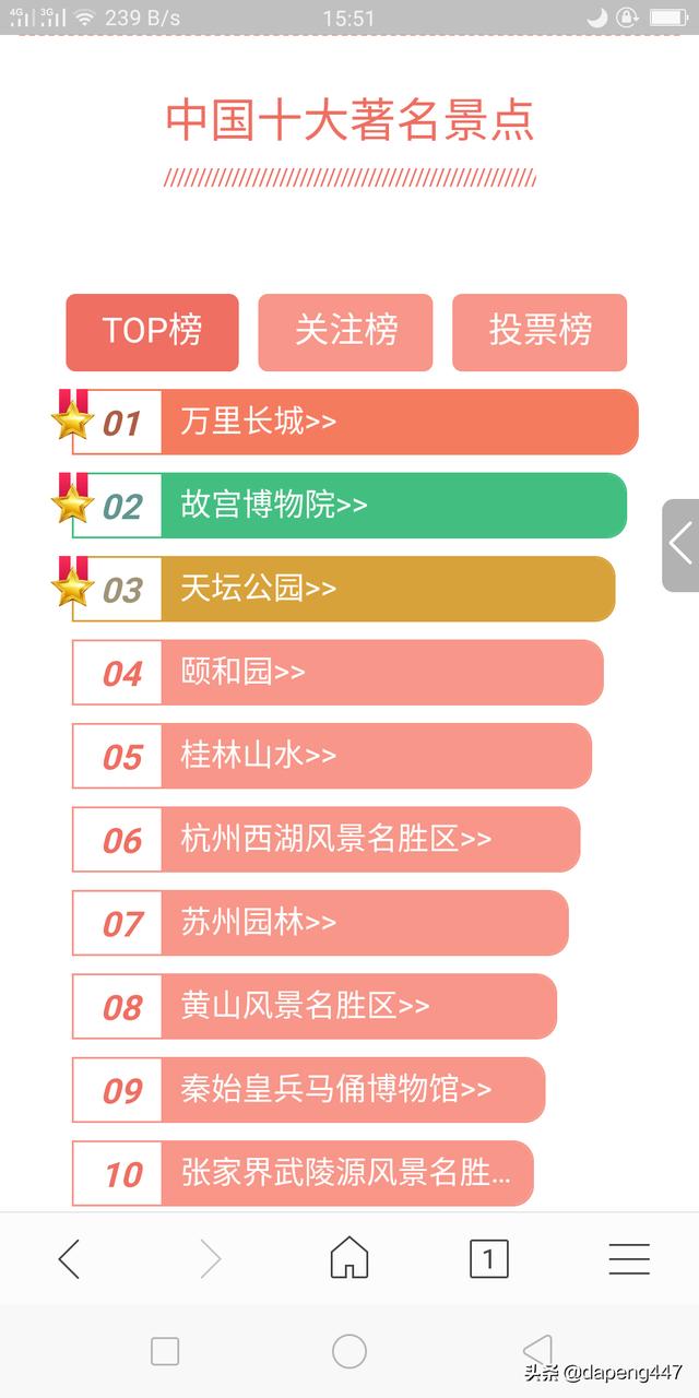 1长城2故宫3天坛4颐和园5桂林山水6杭州西湖7苏州园林8黄山9秦始皇兵马俑10张家界